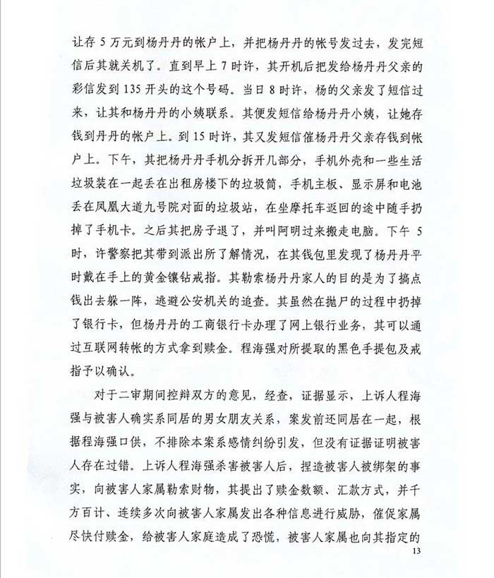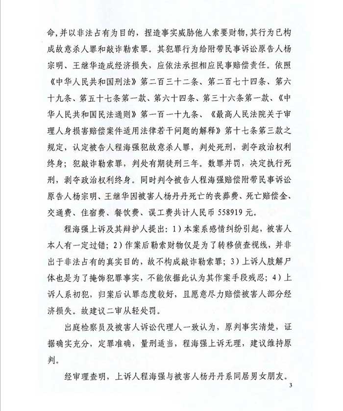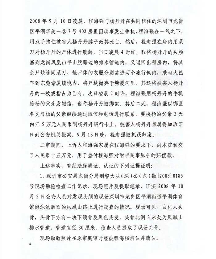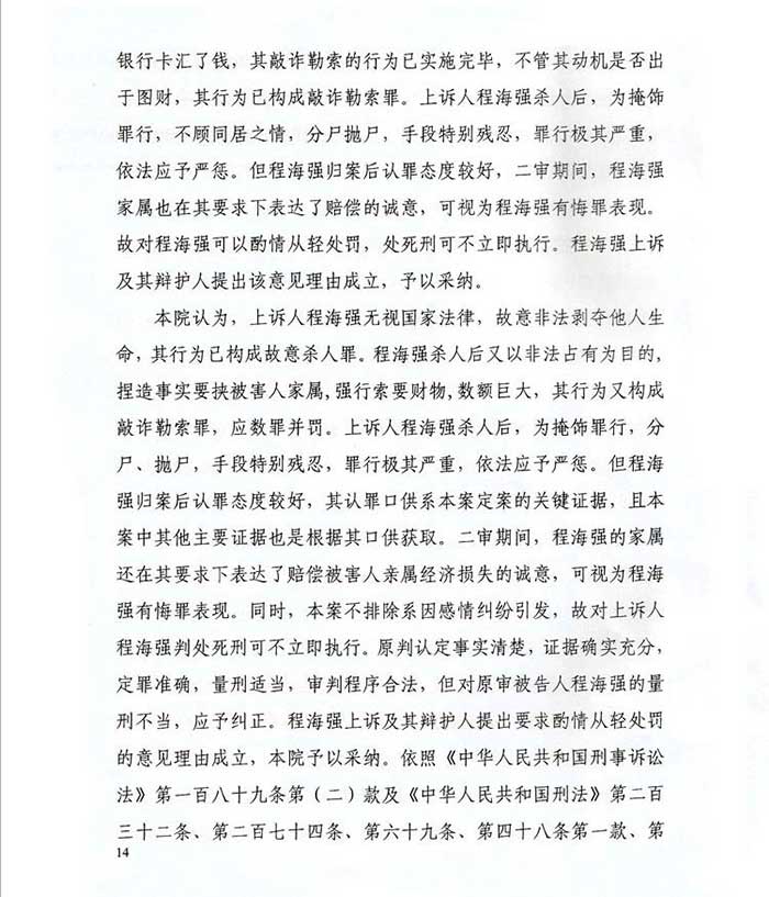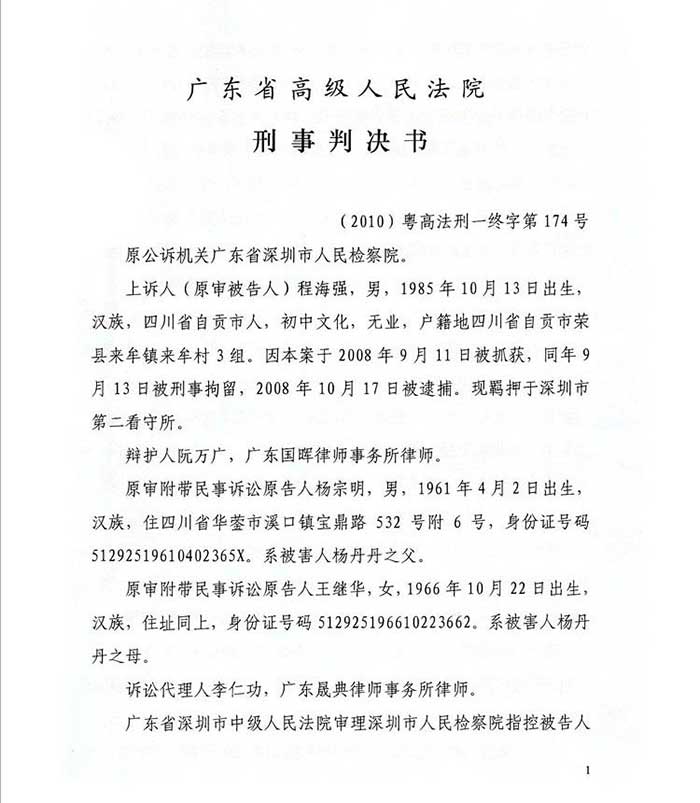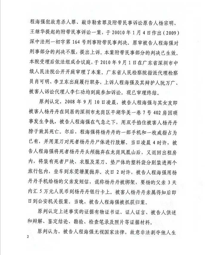 2010年1月4日,深圳市中级人民法院以故意杀人罪判处程海强死刑,立即执行。程海强不服提出上诉,阮万广律师接受其委托担任其辩护人。阮万广律师经查阅卷宗材料,会见上诉人并调查取证,证明程海强与被害人系恋爱同居关系,因感情纠纷引起案件发生,且程海强的口供系本案定案的关键证据,由于其坦白交待使本案得以顺利定案,并力促其家属向被害人家属表达经济赔偿的诚意,向法庭提出从轻处罚建议,二审采纳律师意见,依法改判程海强死刑缓期执行。