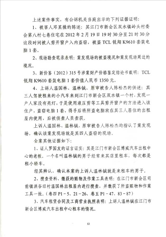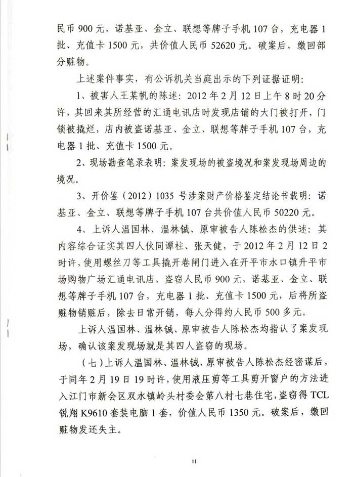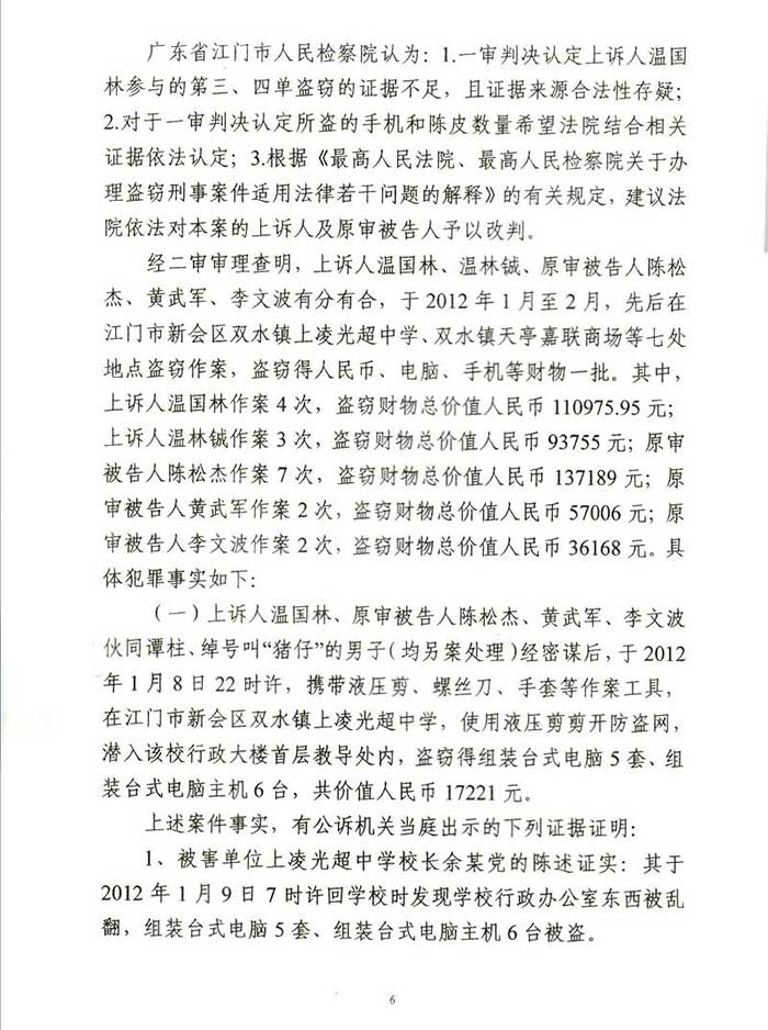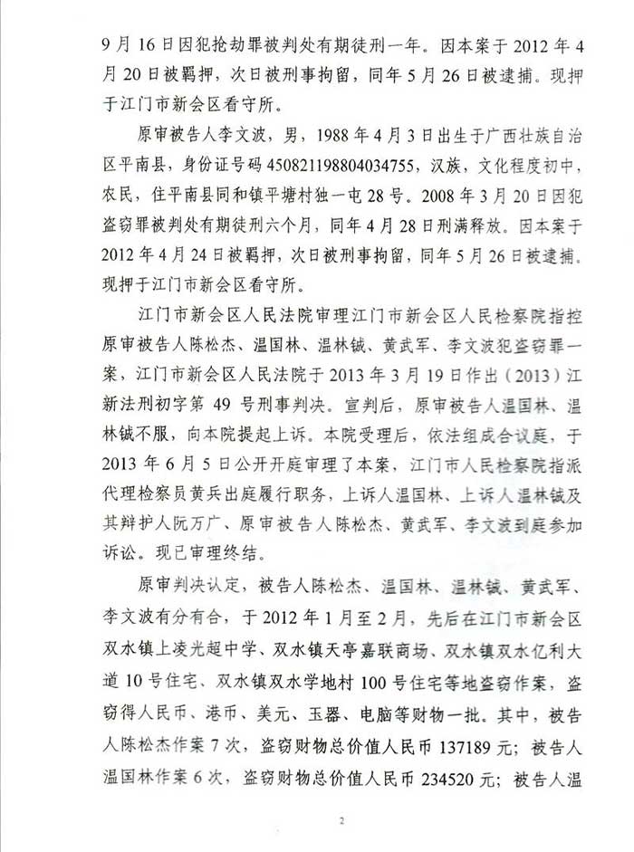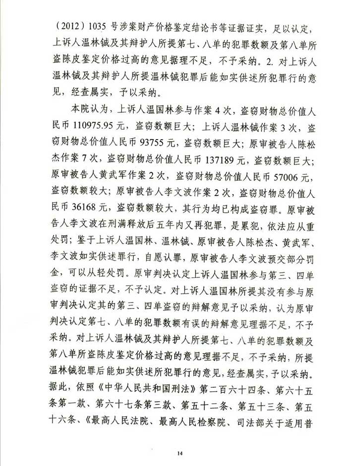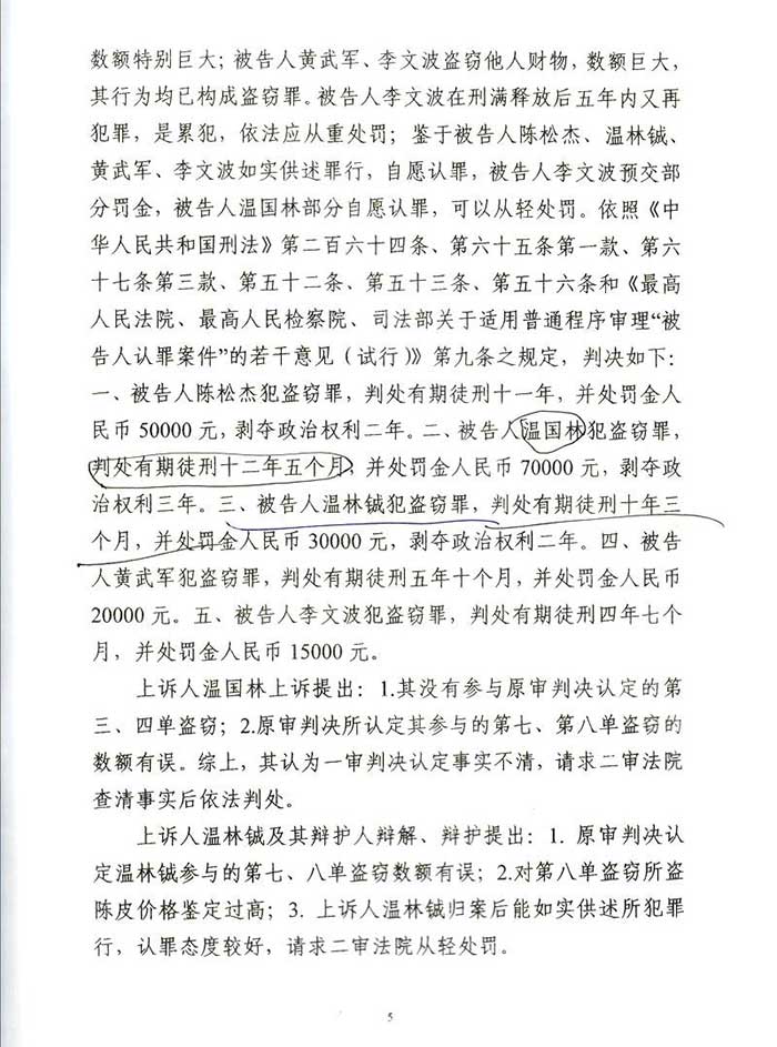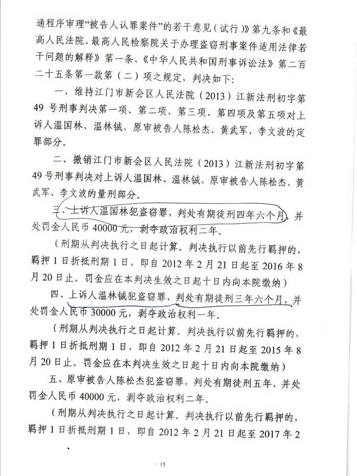 通过阮万广律师代理上诉,二审江门市中级人民法院改判为:一、上诉人温国林犯盗窃罪,判处有期徒刑四年六个月,并处罚金人民币40000元,剥夺政治权利二年。二、上诉人温林铖犯盗窃罪,判处有期徒刑三年六个月,并处罚金人民币30000元。剥夺政治权利一年。