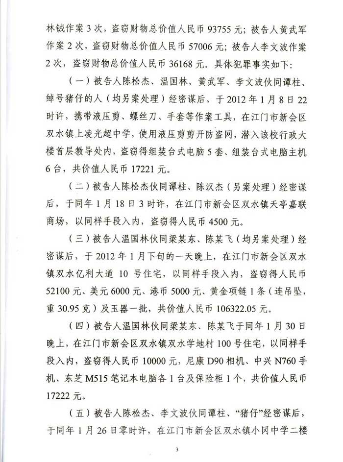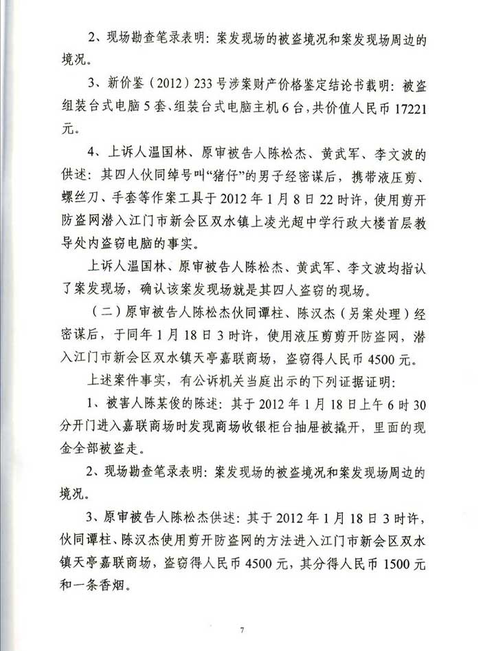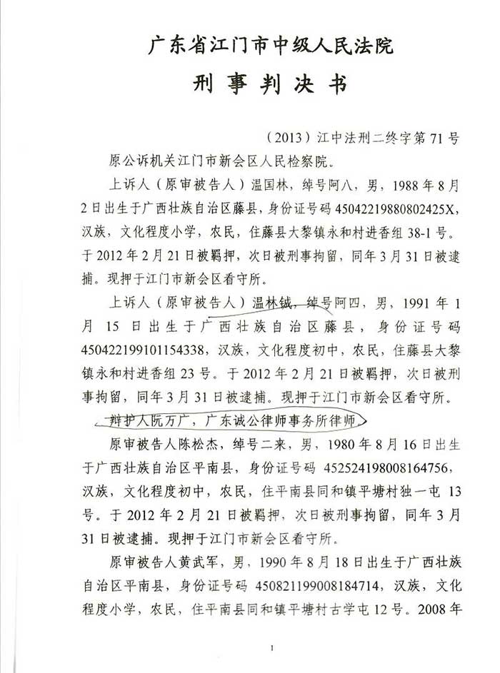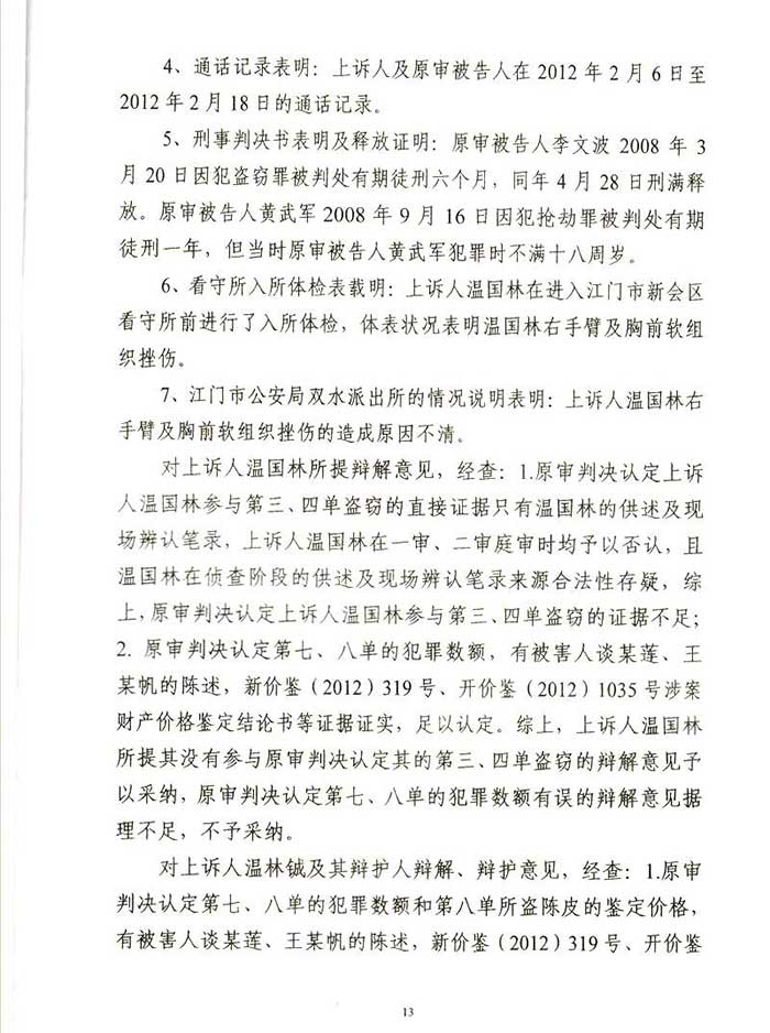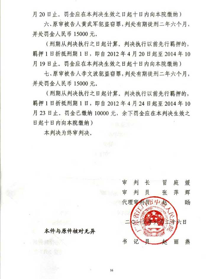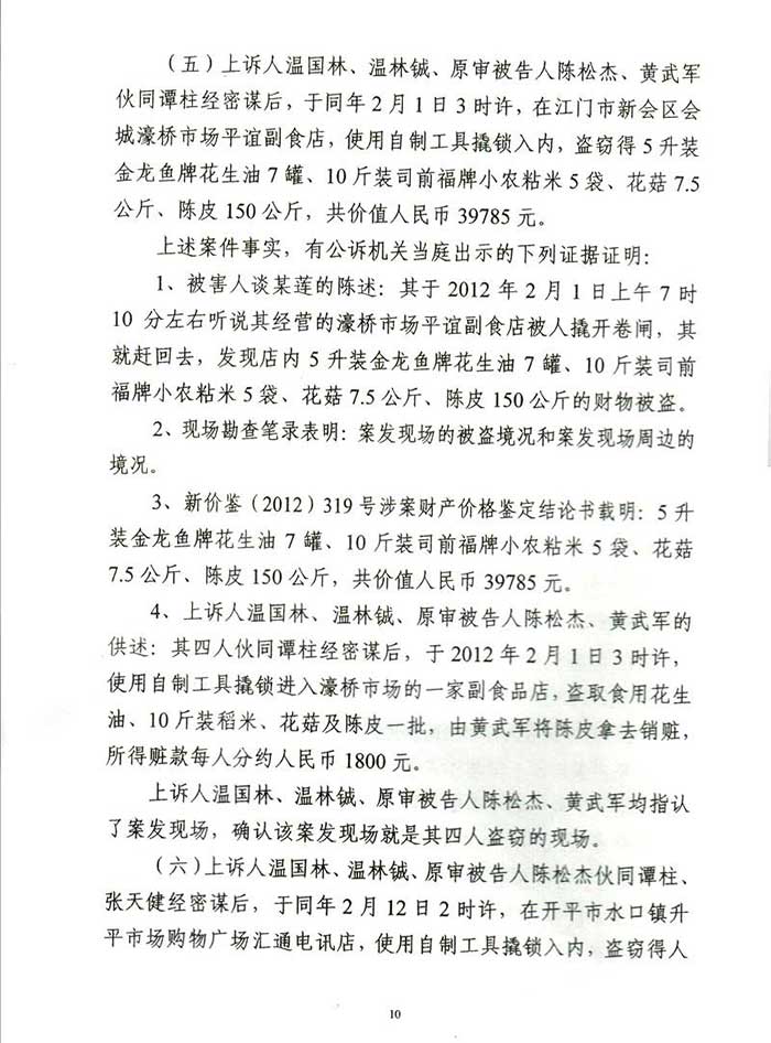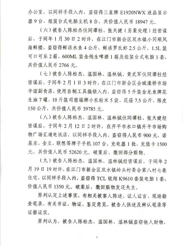 通过阮万广律师代理上诉,二审江门市中级人民法院改判为:一、上诉人温国林犯盗窃罪,判处有期徒刑四年六个月,并处罚金人民币40000元,剥夺政治权利二年。二、上诉人温林铖犯盗窃罪,判处有期徒刑三年六个月,并处罚金人民币30000元。剥夺政治权利一年。