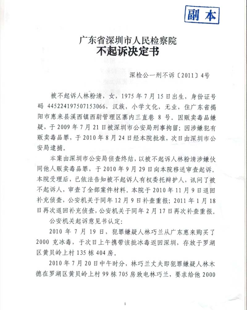 阮万广律师接受委托后,通过询问犯罪嫌疑人,发现林粉清虽有将毒品(冰毒120克)交与其姐夫林木德的事实,但因该毒品是其姐事先装在塑料袋中,外套大塑料袋,让其交与其姐夫,林粉清并不知情。遂提出要对直接装毒品的塑料袋进行指纹鉴定,以确定林粉清是否接触过毒品,以此推定其是否明知大塑料袋内所藏之物是毒品的律师意见。检察机关接受上述意见,委托相关机构进行指纹提取鉴定,鉴定结果:直接包装毒品的塑料袋上并并未检出有林粉清指纹!本案虽有林木德供述林粉清参与贩毒,但林粉清并未承认,其姐也无其参与贩毒的供述。阮万广律师遂以林木德供述系孤证为由提出认定林粉清构成贩毒罪事实不清,证据不足的无罪辩护意见,终被深圳市人民检察院采纳,对林粉清作出疑罪从无的不起诉决定。