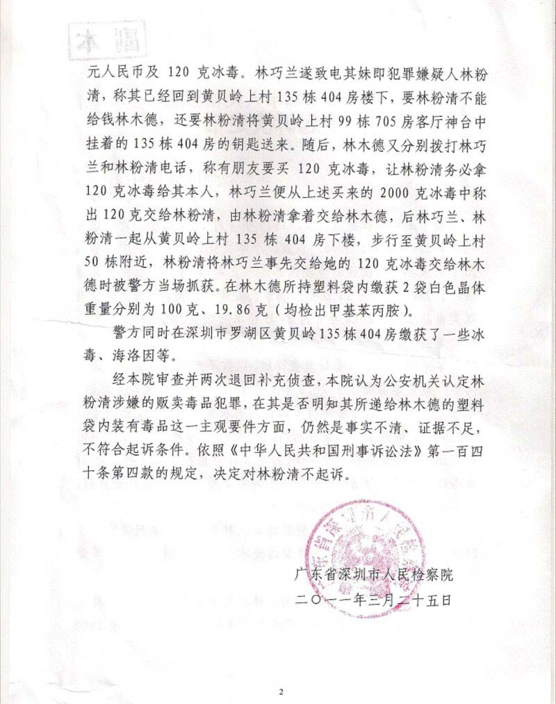 2009年7月21日林粉清因贩毒嫌疑被公安机关拘留,其后被逮捕并移送起诉。