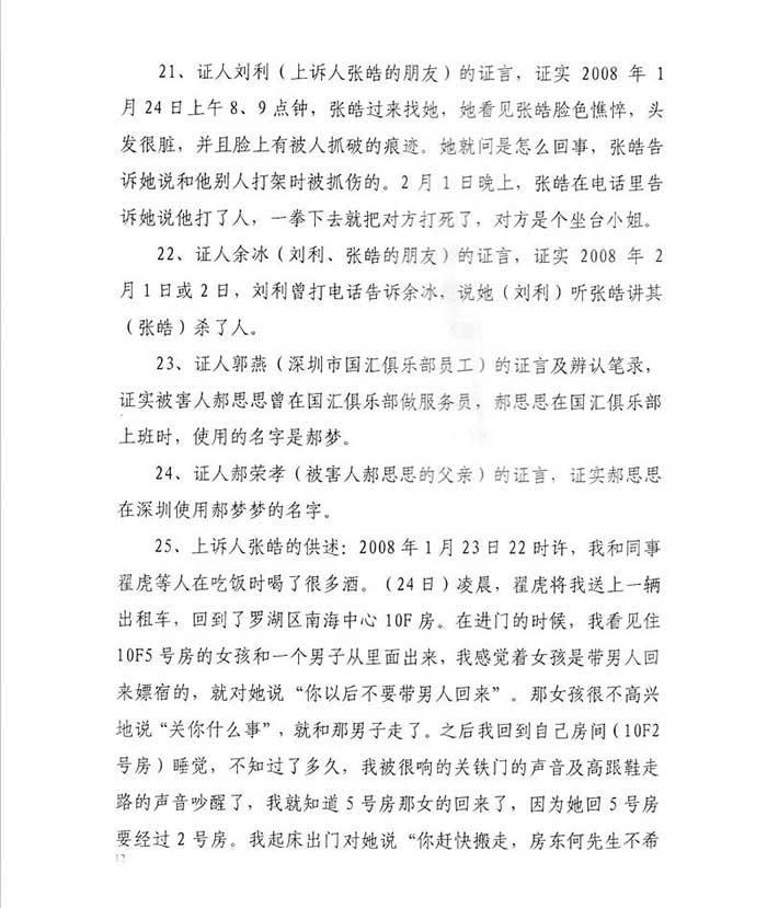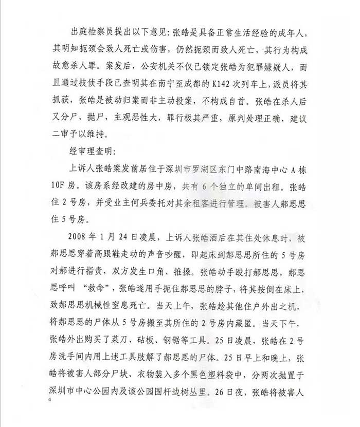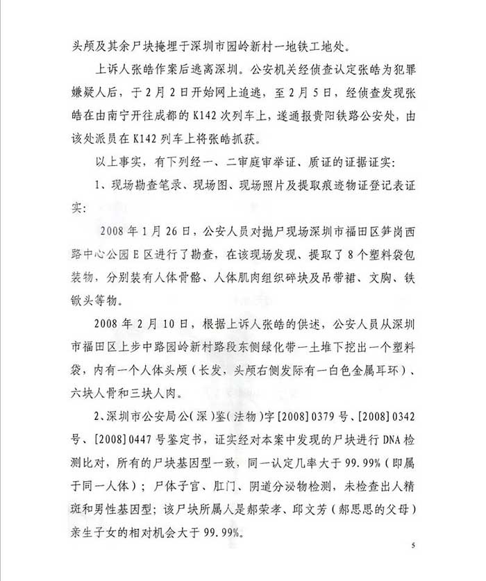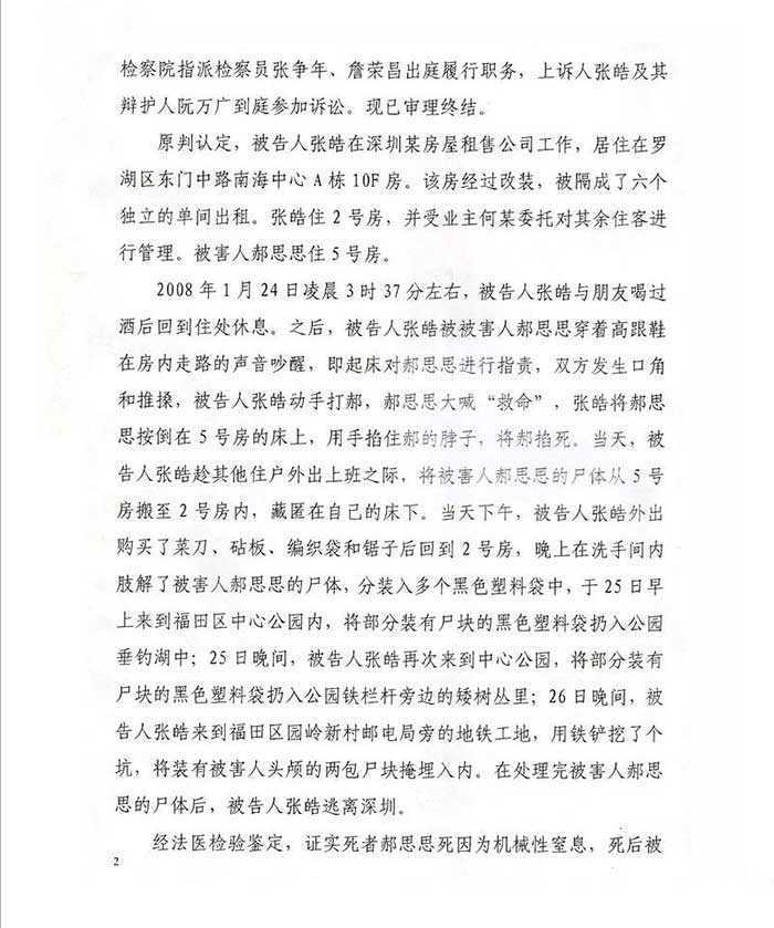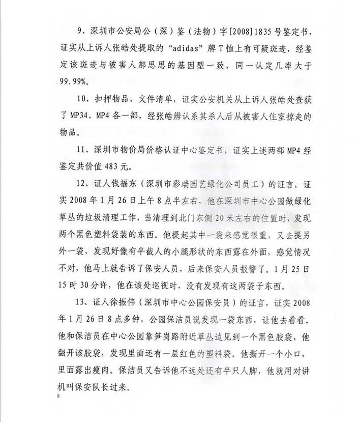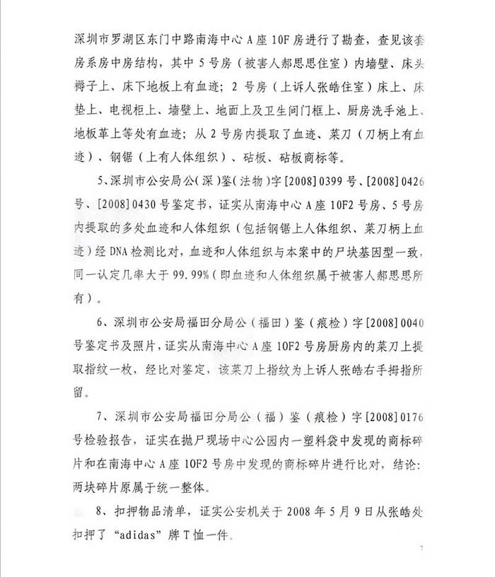 2008年12月11日,深圳市中级人民法院以故意杀人罪判处张皓死刑,立即执行。张皓不服,提起上诉,阮万广律师接受其委托担任辩护人,经查阅卷宗材料,会见上诉人张皓,发现本案一重要情节:上诉人作案后曾对被害人做过人工呼吸进行救助,并导致呕吐,呕吐物沾到上衣T恤衫上这一事实被忽视!阮万广律师根据张皓提供的线索从看守所储藏室提取到张皓作案时穿的上衣T恤衫,并对其依法申请DNA鉴定,后经深圳市公安局(2008)1835号鉴定书认定,证实张皓的T恤衫上有可疑斑迹,该可疑斑迹与被害人基因型一致。辩护人由此推断:不能排除上诉人关于事后对被害人进行救助的事实!因为,如无上诉人对被害人进行人工呼吸,则不会在上诉人的呕吐物中发现被害人的基因型。