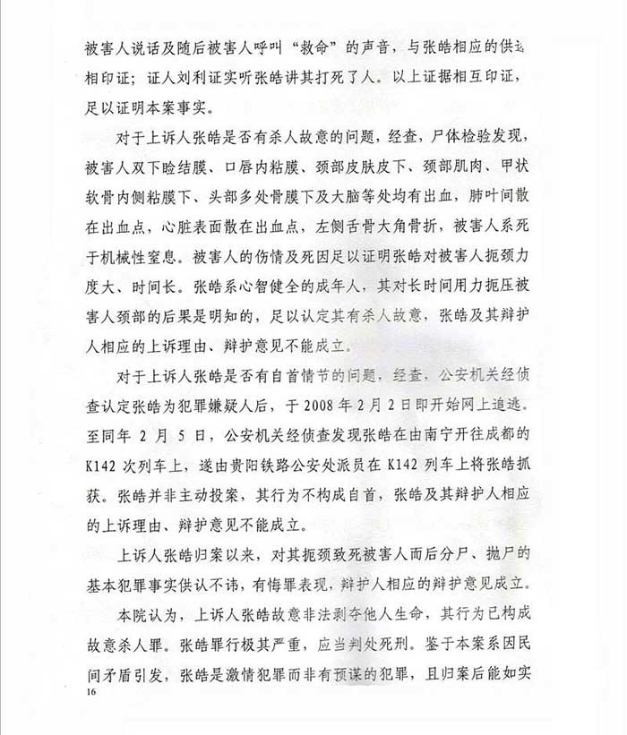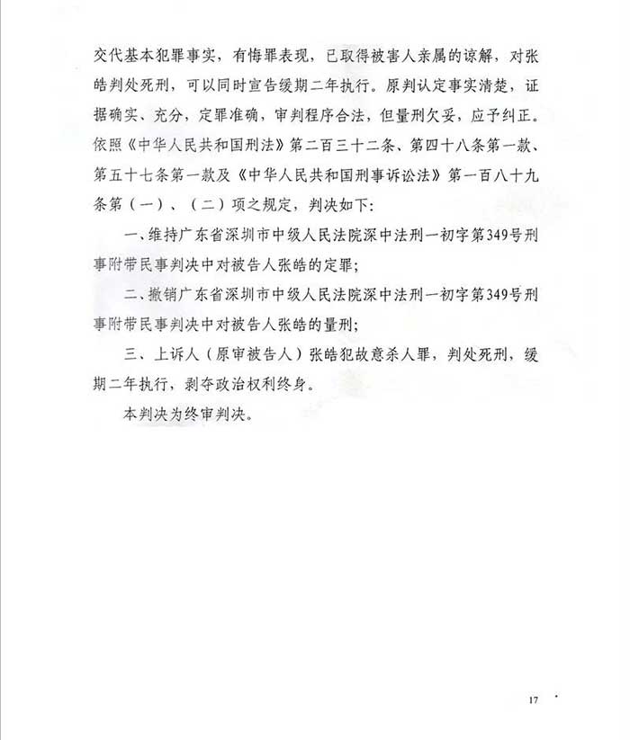 据此,阮万广律师根据最高人民法院,最高人民检察院,公安部,国家安全部,司法部,《关于办理死刑案件审查判断证据若干问题的规定》第76条第三款,“不能排除被告人具有从轻、减轻处罚等量刑情节的,判处死刑应当特别慎重”的规定,提出对上诉人张皓应予从轻处罚的辩护意见等,为二审判决实际采纳,阮万广律师并协助做通被害人家属工作,获得其谅解。二审遂改判上诉人张皓死刑缓期执行。